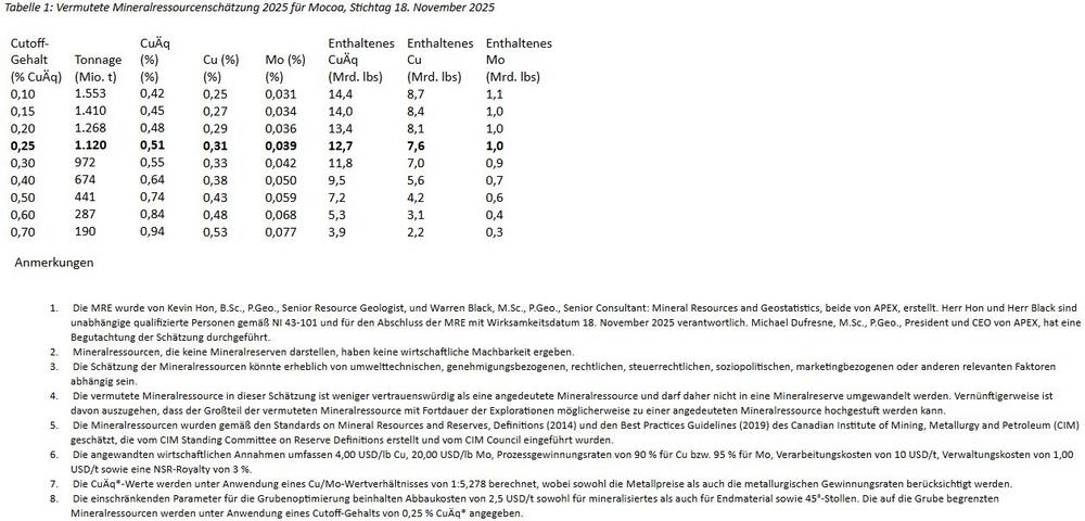 Die MRE1 für Mocoa umfasst vermutete Ressourcen von 12,7 Milliarden Pfund Kupferäquivalent (CuEq*) mit einem durchschnittlichen Gehalt von 0,51 % CuEq*, einschließlich 7,7 Milliarden Pfund Kupfer mit 0,31 % Cu und 1 Milliarde Pfund Molybdän mit 0,039 % Mo, in 1.120 Millionen Tonnen (Mt).