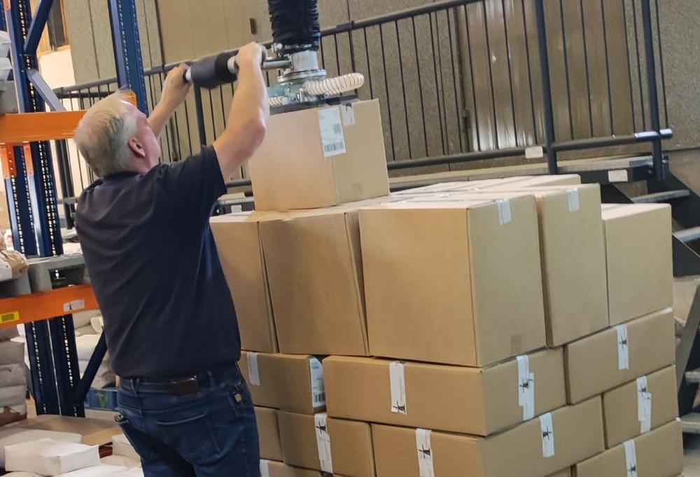 Auf der Fachmesse Empack, der führenden Verpackungsmesse in den Niederlanden, fand das Unternehmen die passende Lösung: den Vakuum-Schlauchheber FIPALIFTmax. Dieser ermöglicht das sichere und ergonomische Heben sowohl von Kartons als auch von Säcken. Zum Einsatz kommen demnach zwei verschiedene Lastaufnahmemittel für maximale Flexibilität bei wechselnden Geometrien: Ein doppelter Rechtecksauger für Kartons in unterschiedlichen Formaten und eine ovale Saugschale mit Dichtschaum für kleine und große Säcke. Eine maßgeschneiderte Montageplatte in Kombination mit einem Knick-Arm-Ausleger erlaubt es den Mitarbeitenden, sich 360 Grad um eine zentrale Säule zu bewegen und zwei Arbeitsplätze flexibel zu bedienen.