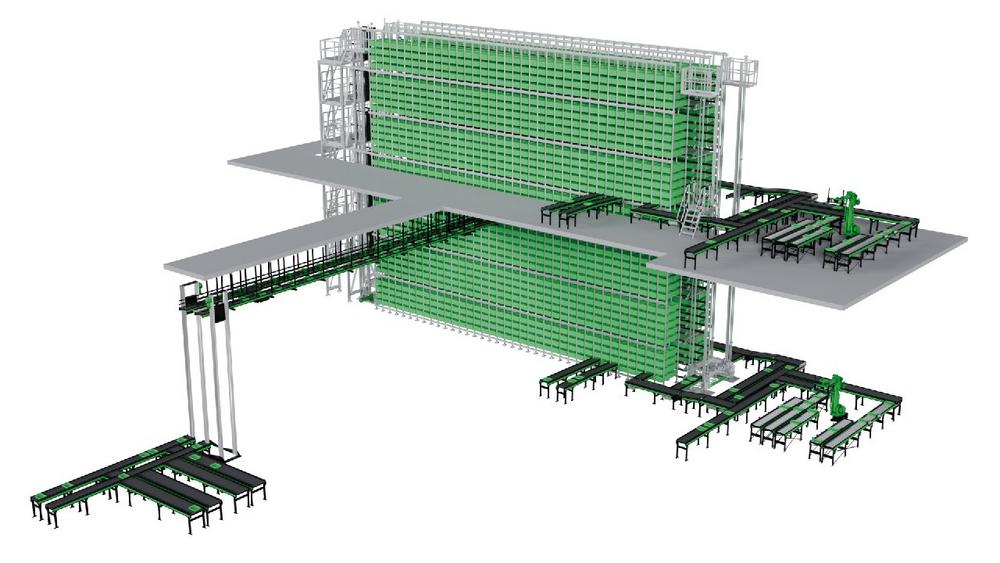 Die Anlage umfasst rund 10.000 Stellplätze, mehrere Shuttle- und Liftmodule sowie eine durchgängige Fördertechnik zur Anbindung von Wareneingang, Kommissionierung und Produktion.