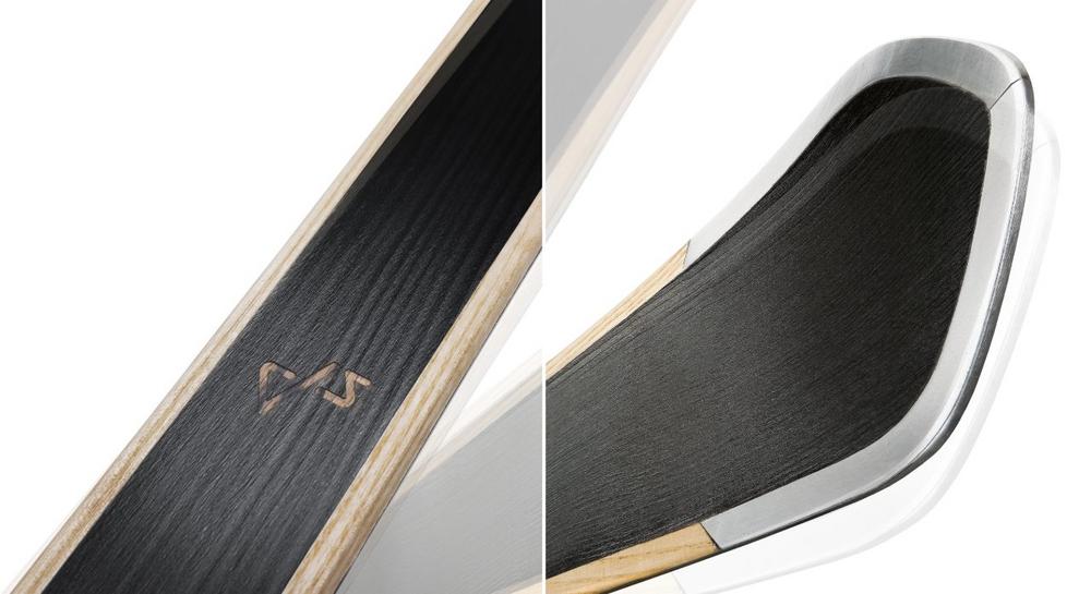 Jüngstes und am weitesten fortgeschrittenes Beispiel dafür ist das Modell dai! der Slalom- und Riesenslalom-Kollektion: Der Kern des Skis besteht ganz klassisch aus Holz und Carbon, die Kanten aus Stahl. Die eigentliche Innovation sind aber das Topsheet und der verwendete Klebefilm: Statt der für Hochleistungsski sonst oft verwendeten, in der Herstellung energieaufwändigen Aluminiumlegierung Titanal®, kommt für das Topsheet verdichtetes Holz von Swiss Wood Solutions zum Einsatz. Dabei handelt es sich um Holz aus nachhaltiger Forstwirtschaft, das durch eine fein justierte Behandlung mit Hitze und Druck über einen längeren Zeitraum schonend und umweltfreundlich komprimiert wird. Dabei verändern sich auch die mechanischen Eigenschaften des Holzes: Mit einer im Vergleich zu Titanal zwei bis drei Mal höheren Steifigkeit sorgt es für eine direkte Kraftübertragung und ein harmonisches Fahrverhalten. Auch macht das auf der Oberseite sichtbare Hochleistungsholzmaterial deutlich, dass es sich hier um keinen gewöhnlichen Standard-Ski handelt.