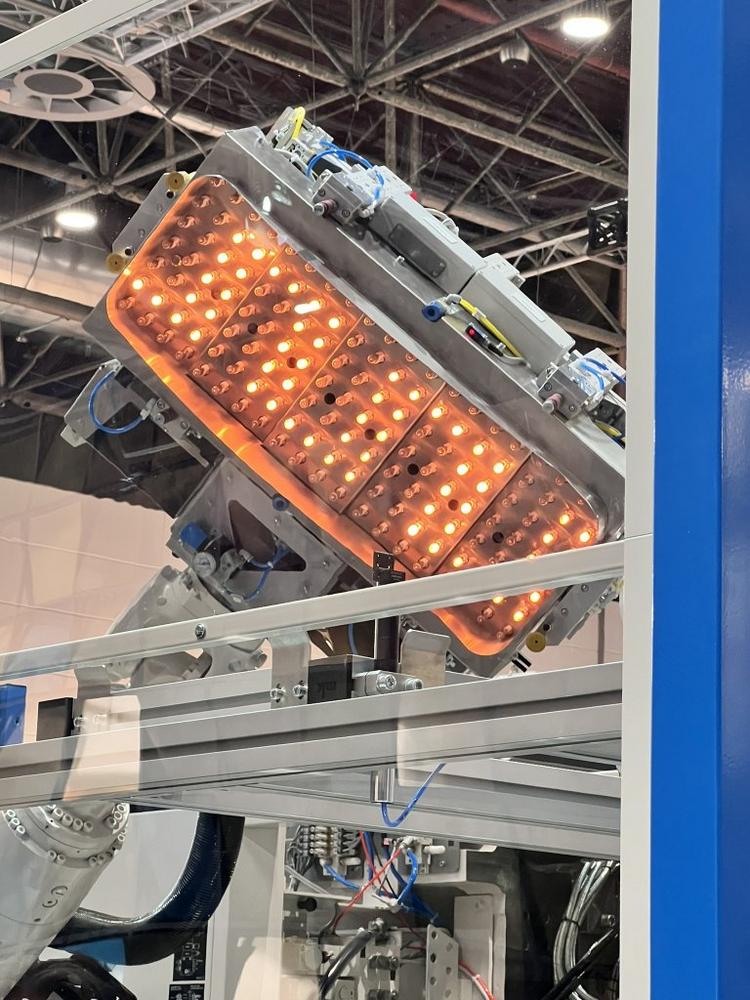 Der 3K-IMD-Prozess wurde von Kurz Automotive in Zusammenarbeit mit dem Maschinenbauunternehmen KraussMaffei entwickelt und auf der K-Messe 2025 live in Aktion präsentiert. Nicht zu übersehen im praktischen Einsatz des Industrieroboters: Der Infrarotstrahler zur Erwärmung der Komponenten direkt im Prozess. Er setzt sich aus Infratec Stiftkontaktlampen zusammen, die eine Schlüsselrolle in der gezielten, prozesssicheren Erwärmung einzelner Funktionsbereiche spielen.