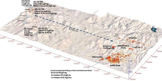– Drei von fünf Bohrlöchern durchteuften mehr als 1 Unze/t Ag bei zwei Zielen, die 1,8 km voneinander entfernt liegen. Mehrere zusätzliche Abschnitte lieferten 3–5 m lange zusammengesetzte Abschnitte mit Gehalten von 15–20+ g/t Ag mit gleichzeitigen Anreicherungen von Au, Zn, Pb und Sb. Dazu gehören 1,5 Meter mit 54,3 g/t Ag (JES-25-125) und 1,5 Meter mit 37,2 g/t Ag, 1,2 % Pb und 0,4 % Zn (JES-25-127).