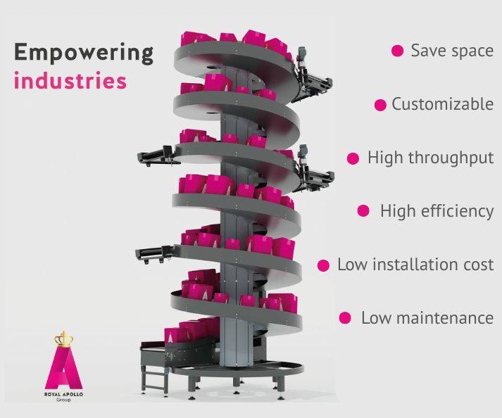 In today’s fast-paced logistics and fulfilment industry, efficiency, space optimization, and reliability are more crucial than ever. As warehouses grow taller, order volumes surge, and labour becomes scarcer, the need for smart vertical conveying solutions continues to rise. Royal Apollo Group’s spiral conveyors are designed to meet these evolving demands, offering a future-proof alternative to traditional material-handling methods.
