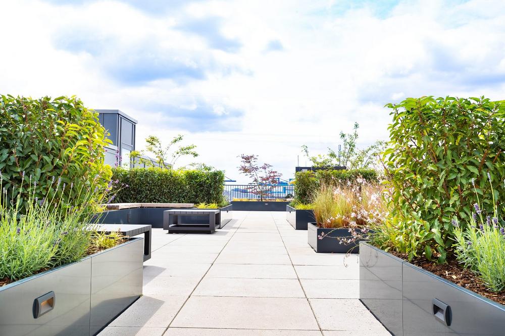 Ein prägendes Element dieses Projekts sind die Optigrün Randelemente aus Aluminium, denn sie übernehmen gleich mehrere Funktionen. Zum einen sorgen sie für eine klare und saubere Abgrenzung zwischen Belagsflächen, Grünbereichen und Aufenthaltszonen. Zum anderen strukturieren sie den Dachaufbau und tragen maßgeblich zu einem aufgeräumten, modernen Erscheinungsbild bei. Gerade auf intensiv genutzten Dachflächen überzeugen die Randelemente durch ihre hohe Witterungsbeständigkeit, Stabilität und Langlebigkeit. Gleichzeitig eröffnen sie Planern große gestalterische Freiheit − von geradlinigen Abschlüssen bis hin zu individuellen Sonderformen. Das Ergebnis ist eine Dachfläche, die weit über ihre ursprüngliche Funktion hinausgeht. Sie bietet Aufenthaltsqualität, schafft klare Wegeführungen und wertet die Architektur des Gebäudes sichtbar auf. Versiegelte Flächen werden sinnvoll genutzt und in hochwertige Dächer verwandelt, die sowohl funktional als auch ästhetisch überzeugen.