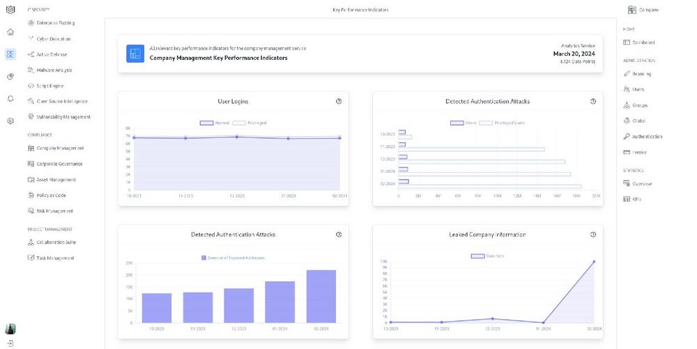 The Attack Analyzer serves as the central nervous system of the managed service offering. This unified dashboard consolidates four critical dimensions of organizational security posture: user authentication patterns and login behaviors, authenticated attack detection weighted by privileged user exposure, email-based attack surface quantification, and dark web intelligence revealing leaked corporate datasets. By correlating these data streams, the platform provides contextualized threat assessment that distinguishes between ambient noise and genuine organizational risk.