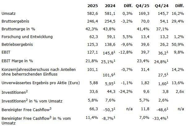 Zur besseren Vergleichbarkeit sind die Vorjahreswerte ohne Sondereffekte (Verkauf der Waferfertigung bzw. Kostenoptimierungsprogramme) dargestellt. Detaillierte Übersichten zu den Finanzzahlen werden mit der Vorlage der finalen Zahlen im Geschäftsbericht 2025 am 19. März 2026 veröffentlicht.