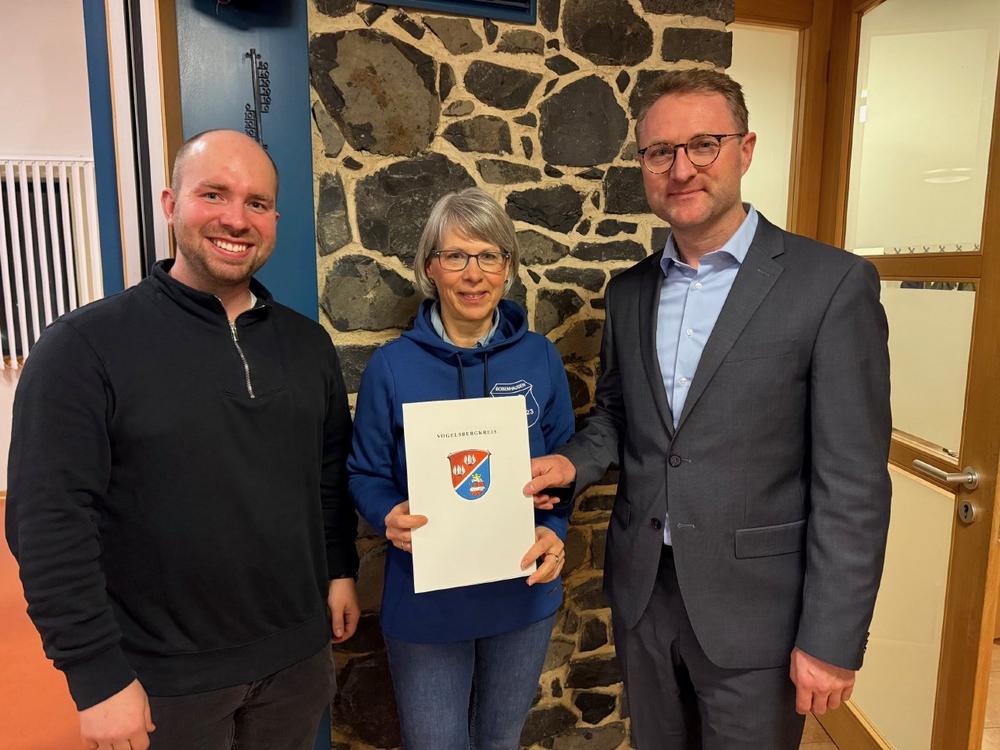 1978 hat der SV Germania Bobenhausen II sein Sportheim gebaut. Und nach knapp 50 Jahren ist das Dach nun reif für die Sanierung. „Die unterstützt der Vogelsbergkreis mit rund 5.000 Euro aus der Sportförderung“, sagt Landrat und Sportdezernent Dr. Jens Mischak bei der Übergabe des Zuwendungsbescheids.
