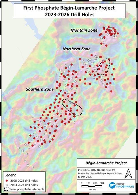 Das Vorzeigeprojekt von First Phosphate, das Konzessionsgebiet Bégin-Lamarche in Saguenay-Lac-Saint-Jean in Québec (Kanada), bietet eine seltene magmatische Phosphatlagerstätte in Nordamerika, die hochreines Phosphat liefert, das sich durch einen sehr geringen Gehalt an Verunreinigungen auszeichnet.