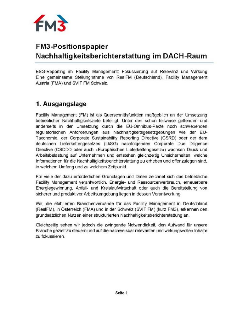 Die drei etablierten Facility-Management-Verbände im DACH-Raum – RealFM e. V. Deutschland, Facility Management Austria FMA und SVIT FM Schweiz – veröffentlichen ein gemeinsames Positionspapier zur Nachhaltigkeitsberichterstattung. Die Verbände betonen die zentrale Rolle des Facility Managements für die Umsetzung betrieblicher Nachhaltigkeitsziele und fordern eine klare Fokussierung auf relevante, wirkungsvolle und praktikable Anforderungen an die ESG-Berichterstattung.