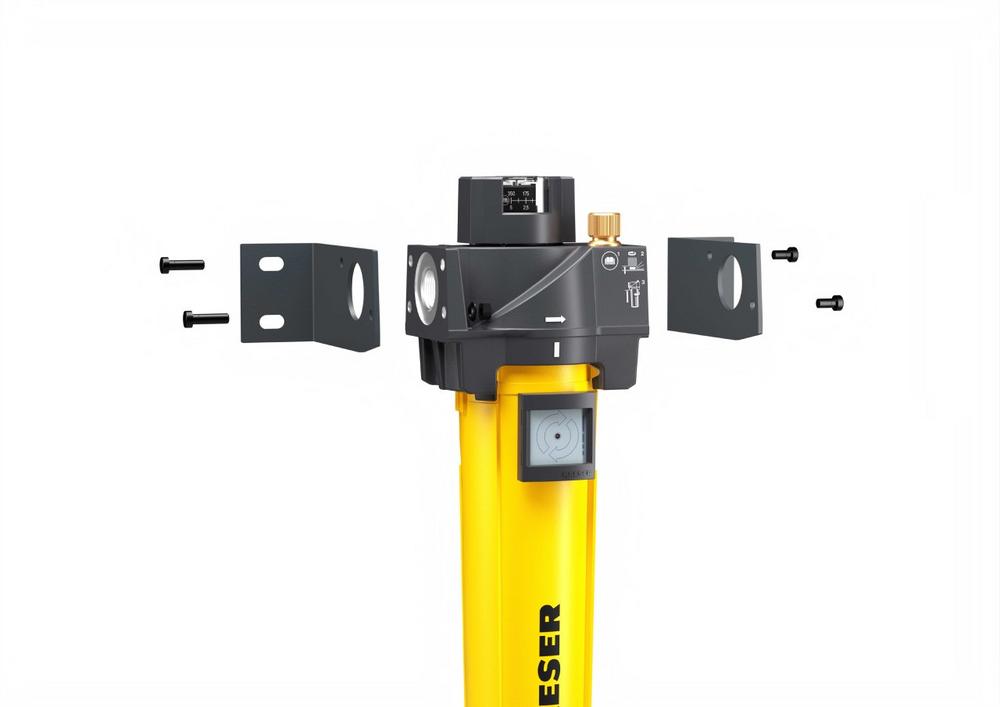 Kopf und Glocke des Filters sind über einen Bajonett-Verschluss verbunden. Bei einem Elementwechsel werden sie, mitsamt der Abdichtung für Gehäuse und Element, dank einer integrierten innovativen Zwangsführung stets automatisch dichtend zueinander positioniert. Eine Arretierschraube fixiert die Glocke in Ihrer Endlage und dichtet dabei gleichzeitig das Filtergehäuse ab. Bei fehlerhafter Montage lässt sich die Verbindung nicht schließen und Druckluft bläst hörbar ab.