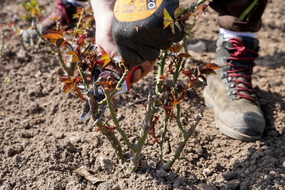 Ein kräftiger Rückschnitt ist die Basis für gesunde Triebe und eine üppige Blüte. Für Edel- und Beetrosen empfiehlt das Team der Gärtnerei die sogenannte 3-Finger-Regel: Es bleiben lediglich drei kräftige Haupttriebe stehen. An jedem dieser Triebe sollten etwa 3 bis 4 „Augen“ sichtbar sein. „Augen“ sind kleine Verdickungen oder Knospen am Trieb – daraus wachsen später neue Zweige und Blüten. Der Schnitt erfolgt ca. 0,5 bis 1 cm schräg oberhalb eines Auges. Wichtig dabei ist, dass die Schnittfläche vom Auge weg zeigt, damit Regenwasser optimal ablaufen kann und die Knospe nicht schädigt.