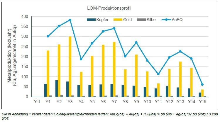 The PEA considers a conventional drill, blast, load, and haul open pit operation mining an average of 126,000 tpd over the 14.6-year life of mine. It envisions that resources will be processed at a nominal rate of 40,000 tpd by conventional flotation to generate a gold-rich copper concentrate, with the tailings of the rougher flotation stage reporting to a leach circuit to generate gold doré on-site, for a combined LOM average of 88.9% and 77.8% recovery for gold and copper, respectively.