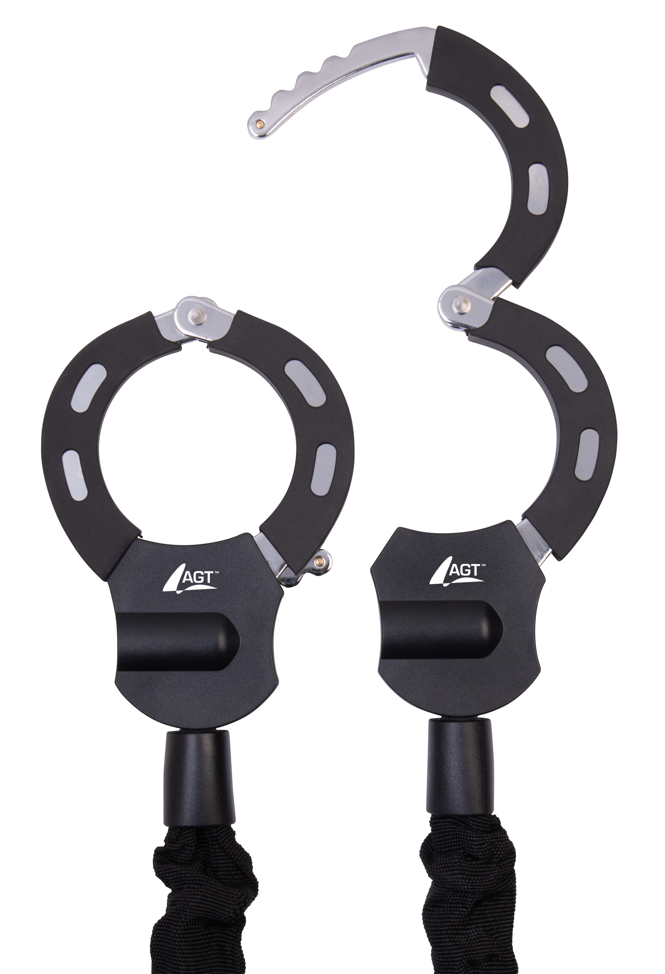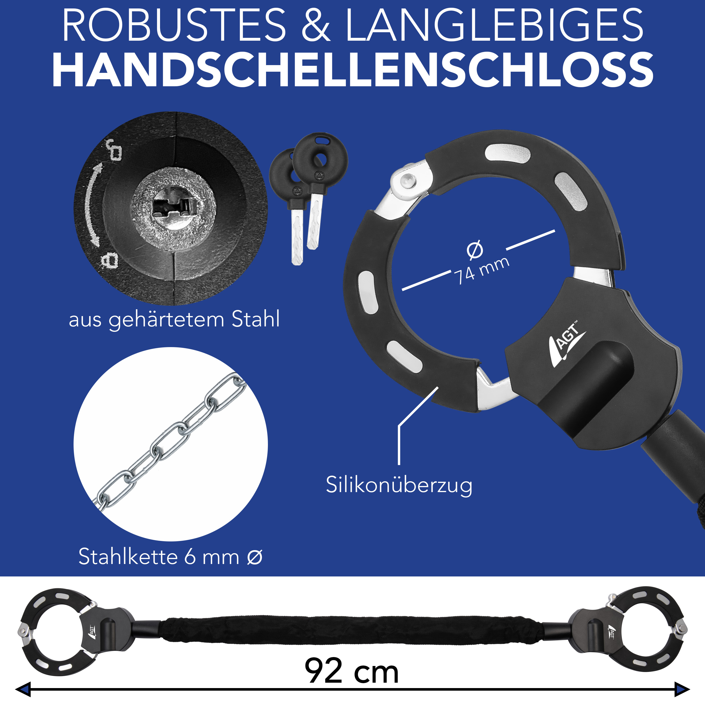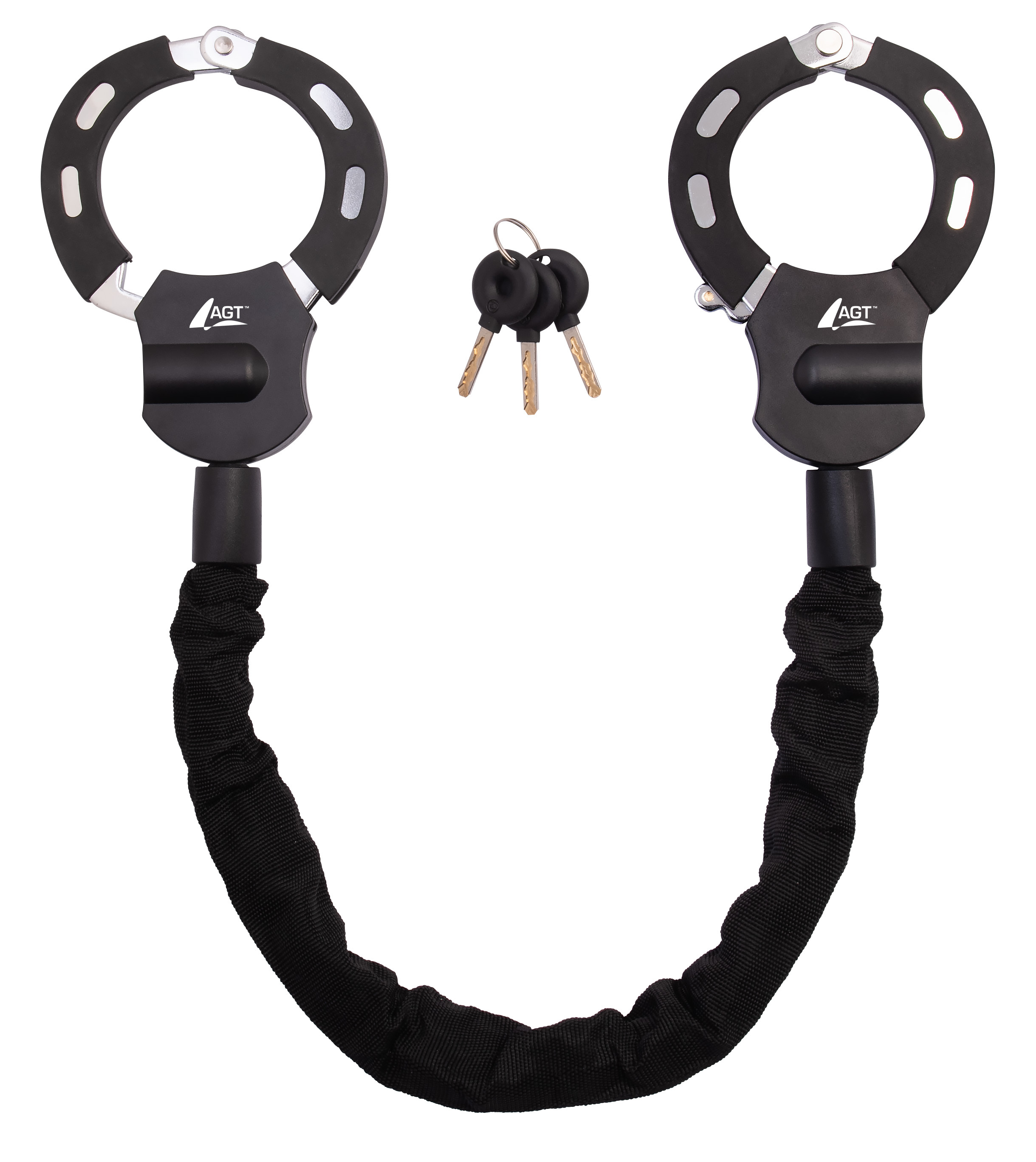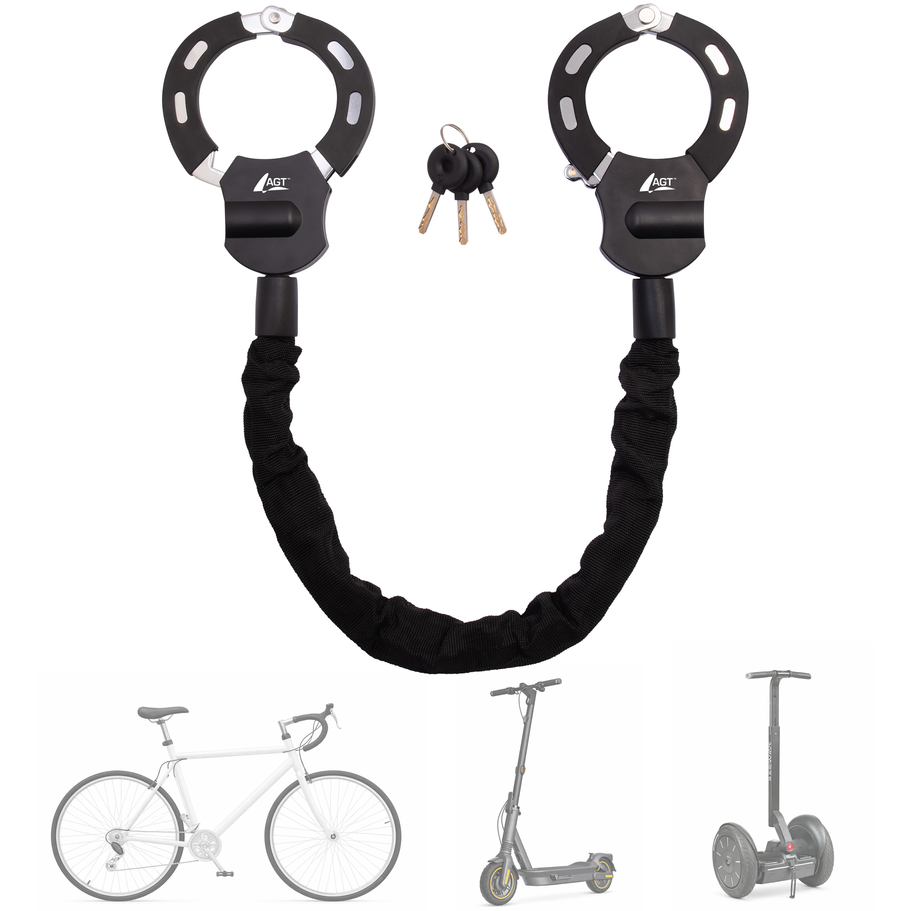 Das Handschellenschloss von AGT wurde speziell für E-Scooter konzipiert. Es eignet sich aber auch für Fahrräder, E-Bikes, Roller und Kinderwagen. Das Schloss verfügt über zwei 74 mm große, stabile Metallschellen mit einer Silikonschutzschicht und eine 6 mm starke Stahlkette, die durch einen Textilschlauch geschützt ist. Mit einer Gesamtlänge von 92 cm lässt es sich flexibel an Fahrradbügeln, Zäunen oder Verkehrsschildern befestigen. Im Lieferumfang sind drei Schlüssel enthalten. Diese innovative und praktische Lösung ist ideal, um den E-Scooter vor Diebstahl zu schützen.