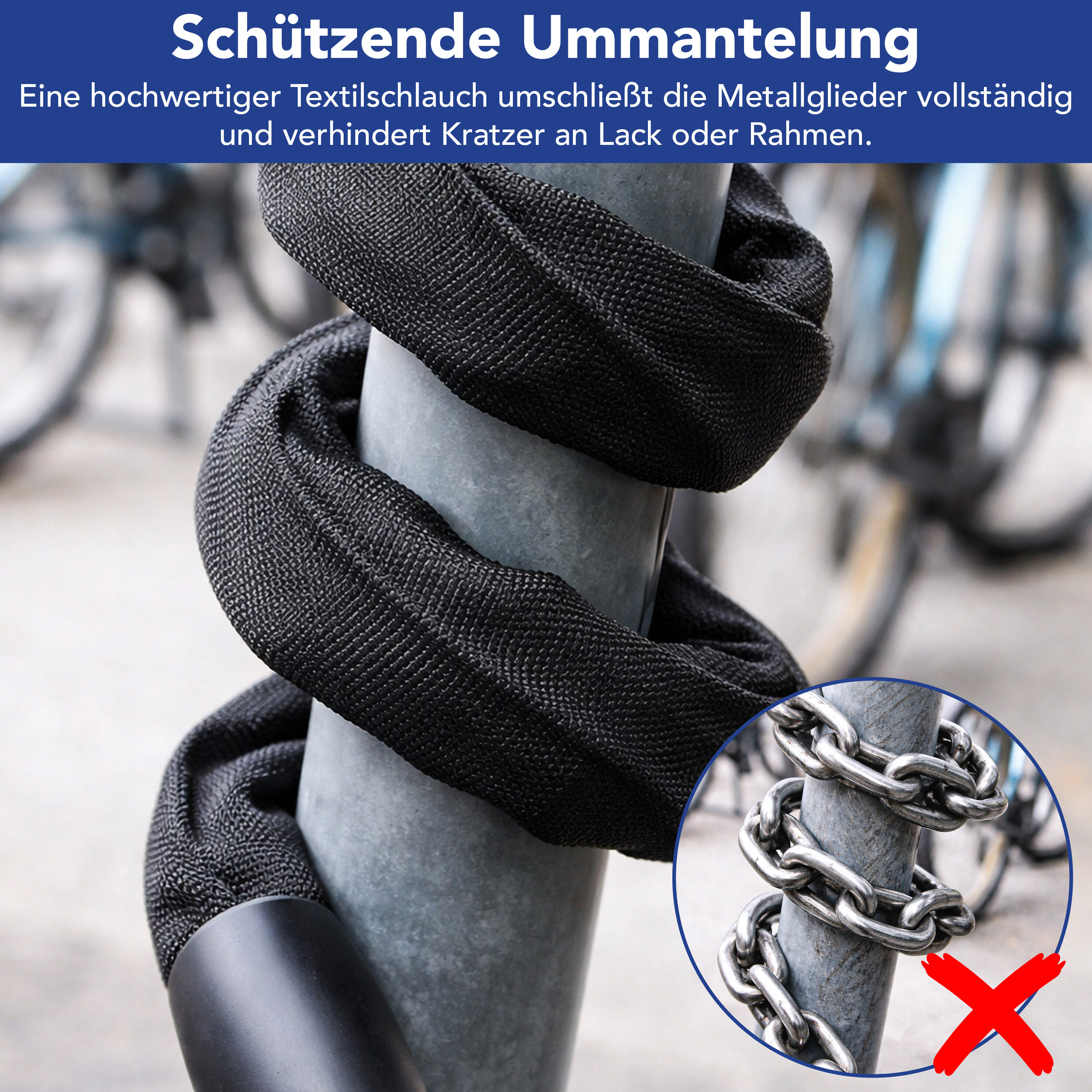 • Robuste Stahlkette mit 6 mm Ø und Textilschlauch