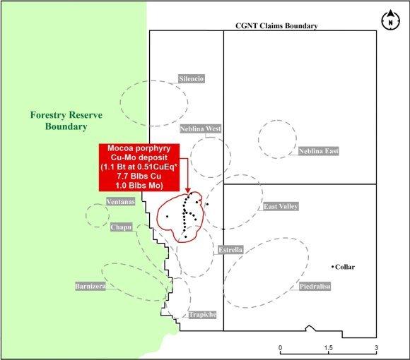 Die Mineralressourcenschätzung1 für Mocoa umfasst vermutete Ressourcen von 12,7 Milliarden Pfund Kupferäquivalent (CuEq*) mit einem durchschnittlichen Gehalt von 0,51 % CuEq*, einschließlich 7,7 Milliarden Pfund Kupfer mit 0,31 % Cu und 1 Milliarde Pfund Molybdän mit 0,039 % Mo, in 1.120 Millionen Tonnen (Mt).