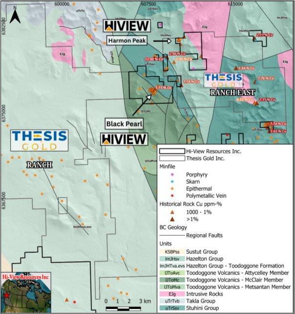 Vor kurzem gab Thesis Gold & Silver Inc. bekannt, dass es an zwei separaten Zielen eine porphyrartige Alteration identifiziert hat: Bei einem Ziel wird dies als Lithocap-System interpretiert, das einen potenziellen Porphyr in der Tiefe überlagert; das zweite Ziel weist eine innere propylitische Alteration mit Kupfer-Silber-Mineralisierung auf, die mit der Freilegung eines tiefer liegenden Systems auf Porphyr-Ebene übereinstimmt. Zusammengenommen deuten diese Ergebnisse auf ein Gebiet mit mehreren Porphyrsystemen hin, die sich in unterschiedlichen Erhaltungsstadien befinden – genau die Art von geologischer Umgebung, in der sich das Projekt Black Pearl nach Ansicht von Hi-View befindet.
