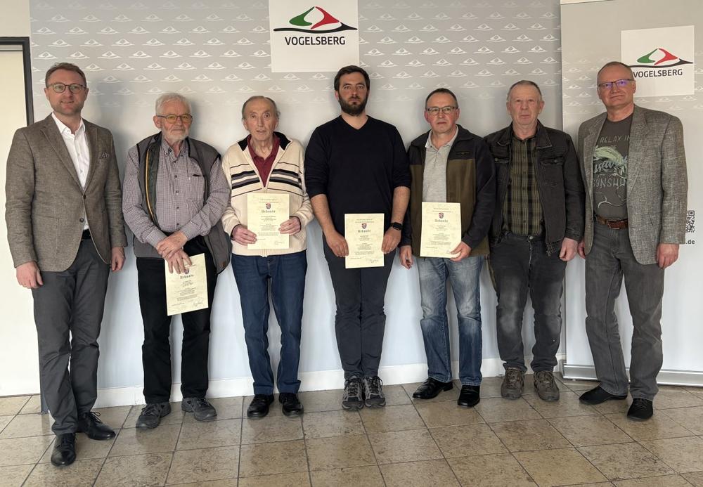 Das ist schon eine sehr beeindruckende Zahl: 40 bis 50 Millionen Bienen schwärmen im Sommer aus in die Vogelsberger Natur. Dass ws so bleibt, darum kümmern sich engagierte Imker, die wiederum von den sogenannten Bienensachverständigen des Vogelsberger Veterinäramtes unterstützt werden. Unter anderem haben Günter Euler, Hans Heinrich Rehberger, Niklas Wudel, Gerhard Roth und Günter Lemmer diese Aufgabe übernommen. Von Landrat Dr. Jens Mischak wurden sie jetzt für weitere drei Jahre bestellt.