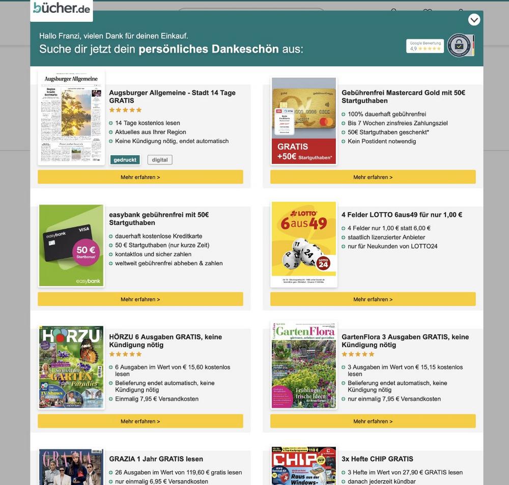Die Quote der Online-Besteller, die nach dem Kauf ein solches Dankeschön mitnehmen, liegt im Durchschnitt bei drei bis vier Prozent, so Stütz. Je Marktsegment gibt es Unterschiede. Im Checkout von Elektronik-Händlern greifen bis zu zwei Prozent zu, bei Apotheken oder Buchhändlern bis zu 5 Prozent. Etwa die Hälfte der Dankeschön-Bestellungen entfällt auf Medienangebote, die andere auf ein breites Spektrum aus Produktproben, Wein oder kostenlose Kreditkarten.