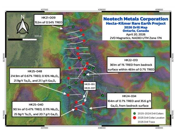 „Wir freuen uns, weiterhin lange, breite Zonen mit einer durchgehenden Mineralisierung ab der Oberfläche und in geringen Tiefen auf dem Projekt Hecla-Kilmer zu definieren, wodurch wir erheblichen Wert schaffen und die Größe dieses einzigartigen Systems weiter hervorheben“, sagte Reagan Glazier, CEO von Neotech Metals. „Die beständigen Galliumgehalte in diesen Abschnitten sind besonders wichtig, da Gallium eine wachsende Rolle in Halbleiter-Lieferketten und Technologien für die Energiewende spielt. Wir sind stolz darauf, eine einzigartige Lagerstätte für kritische Mineralien freizulegen, die das Potenzial hat, zur Rückverlagerung und zur Sicherung der wesentlichen Bausteine beizutragen, die für die heutigen fortschrittlichen und sauberen Energietechnologien benötigt werden.“