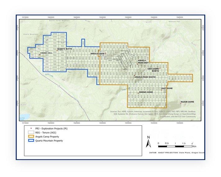 Das Goldprojekt Quartz Mountain befindet sich auf Flächen des National Forest System, das vom USFS in Oregon verwaltet wird. Das Goldprojekt Quartz Mountain besteht aus zwei Hauptgebieten: Angel‘s Camp und Quartz Mountain (siehe Abbildung 1). QGold hat beim USFS Anträge auf Erteilungen von Explorationsgenehmigungen für beide Zielgebiete eingereicht, und das Unternehmen freut sich nun, bestätigen zu können, dass die anstehenden Explorationsaktivitäten bei Angel‘s Camp offiziell genehmigt wurden.