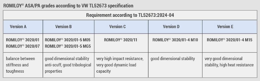 As shown in the table, ROMIRA offers the appropriate type for each version of the Volkswagen Group’s TL52673 standard.