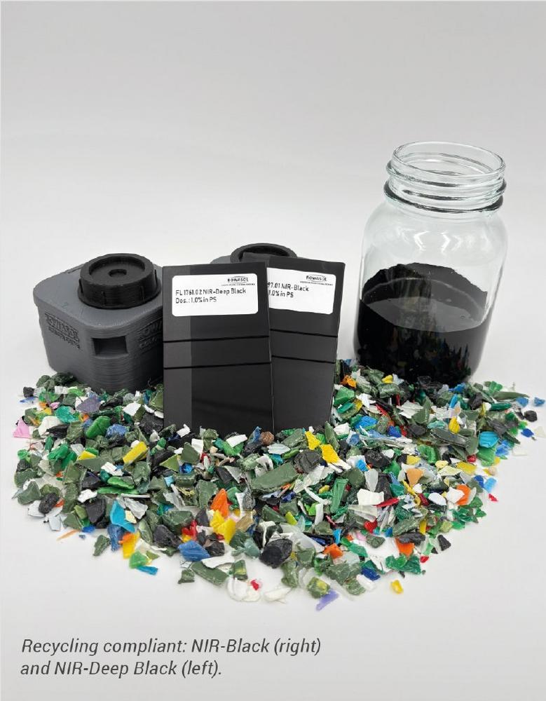 ROWASOL NIR-DEEP BLACK offers the perfect solution: It is a deep black color that is brilliant in visible light yet NIR-detectable with a strong reflective signal for reliable sorting. It is also compliant with food contact regulations, non-magnetic, and suitable for use in polar thermoplastics (e.g., PS, PET, ABS, PC, and PMMA). The slightly less deep black version, NIR- BLACK, is also available for PE and PP.