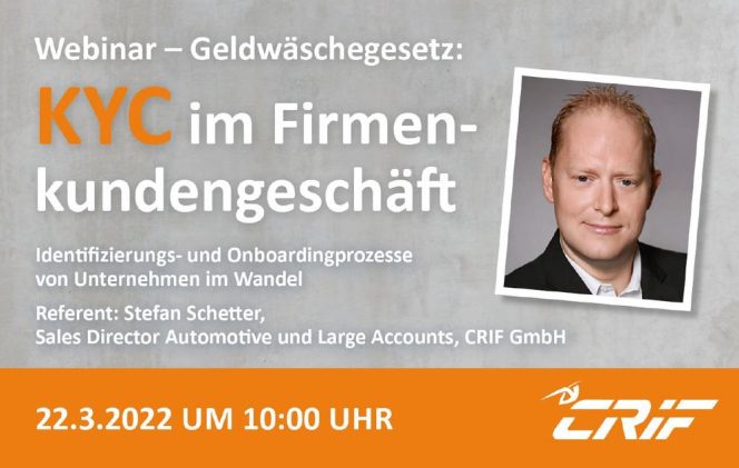 Webinar: Geldwäschegesetz: KYC im Firmenkundengeschäft – Identifizierungs- und Onboardingprozesse von Unternehmen im Wandel 22.3.2022 von 10:00 Uhr bis 11:00 Uhr: Geldwäschegesetz: KYC im Firmenkundengeschäft Identifizierungs- und Onboardingprozesse von Unternehmen im Wandel Referent: Stefan Schetter; Sales Director Automotive und Large Accounts; CRIF GmbH Hier können Sie sich für das Webinar am 25.1.2022 um 10:00 Uhr anmelden: […]