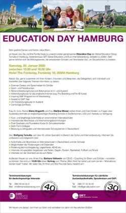 Erstmalig wird GET Global Education Tumulka den diesjährigen Education Day in Hamburg zusammen mit seinem Partner Euro Internatsberatung durchführen. Zum 30jährigen Bestehen von GET steht ein Expertenteam gemeinsam mit 18 Internatsschulen aus dem In- und Ausland sowie Sprachreiseveranstaltern interessierten Eltern und Schülern für persönliche und individuelle Gespräche zur Verfügung. Über folgende Themen können die anwesenden […]