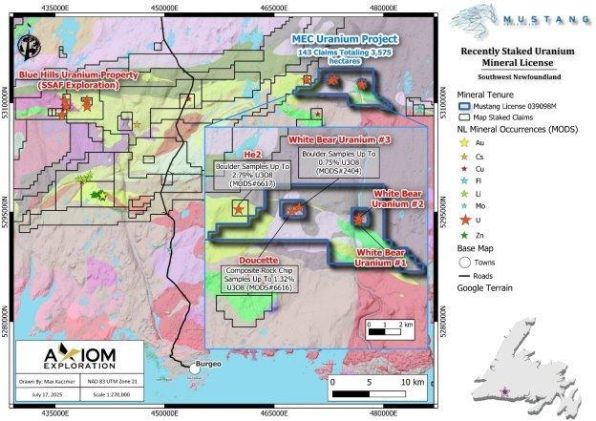 Mustang Energy Corp. steckt zwei neue Mineralkonzessionsgebiete in Neufundland ab: das Uranprojekt Onyx und das Kupfer-Silber-Projekt Bridal Veil