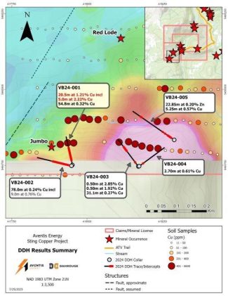 – VB24-001: 20,5 m mit 1,21 % Kupfer einschließlich 5,0 m mit 2,22 % Kupfer und 54,8 m mit 0,32 % Kupfer – VB24-002: 78,0 m mit 0,24 % Kupfer einschließlich 9,0 m mit 0,76 % Kupfer – VB24-003: 0,50 m mit 2,85 % Kupfer und 0,50 m mit 1,92 % Kupfer und 31,1 m mit 0,27 % Kupfer – VB24-004: 2,70 m mit […]
