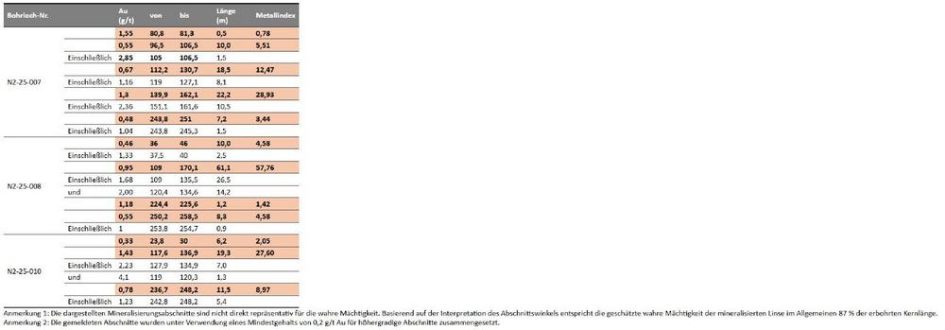 – N2-25-007: 1,3 g/t Au über 22,2 Meter, beginnend bei 139,9 Metern Bohrlochtiefe, 121,2 Meter vertikal. Der hervorgehobene Abschnitt umfasst 2,36 g/t Au über 10,5 Meter. – N2-25-008: 0,95 g/t Au über 61,1 Meter, beginnend bei 109 Metern Bohrlochtiefe, 94,4 Meter vertikal. Der hervorgehobene Abschnitt umfasst 1,68 g/t Au über 26,5 Meter. – N2-25-010: 1,43 g/t Au über 19,4 Meter, […]