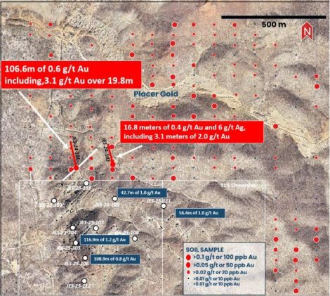 . Wichtigste Ergebnisse: – Bisher beste Ergebnisse außerhalb der Main Zone – 250 Meter von Bohrloch JES-24-79 aus dem Jahr 2024 entfernt, das 42,7 Meter mit 1,0 g/t Au lieferte. – Anomale Mineralisierung von der Oberfläche bis 106,8 Meter Tiefe mit durchschnittlich 0,6 g/t Au Obere hochgradige Zone liefert 19,8 Meter mit 3,1 g/t Au – Erkundungsbohrungen entdecken anomale Gold- und Silbermineralisierung 16,8 Meter mit […]