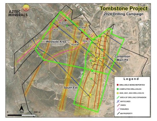 Aztec entdeckt bedeutsame Silber-Gold-Mineralisierung und durchschneidet 85,4 m mit 47,31 g/t Silberäquivalent (AgÄq), einschließlich 24,4 m mit 106,3 g/t AgÄq, bei First-Pass-Bohrungen in Zielgebiet Westside in Konzessionsgebiet Tombstone, Arizona, USA