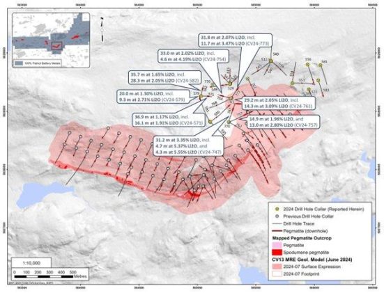 Patriot durchteuft 31,2 m mit 3,35 % Li2O bei CV13, einschließlich 4,7 m mit 5,37 % Li2O, und erweitert damit die hochgradige Vega Zone in bedeutendem Maße