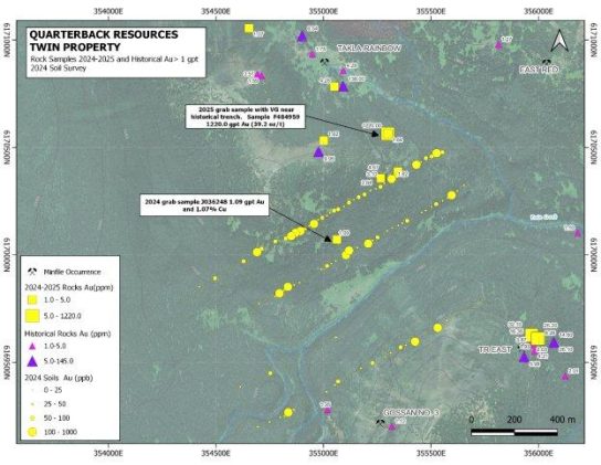 Quarterback meldet Analyseergebnisse von Stichproben mit bis zu 1.220 Gramm Gold pro Tonne aus dem Projekt Twin
