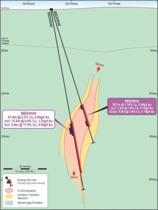 – Jüngste außergewöhnliche Kupfer- und Goldergebnisse von Diamantbohrloch BBDD0045 bei der Entdeckung Bluebird haben die westliche hochgradige Kupfer-Gold-Zone mit einem herausragenden Abschnitt erweitert (siehe Querschnitt, Abbildung 1): o 61,8 m mit 2,3 % Cu und 0,4 g/t Au (2,8 % CuÄq*) ab 149,2 m (Bohrlochtiefe) – einschließlich 13,2 m mit 9,6% Cu und 1,51 g/t Au (11,1 % CuÄq*) ab 149,9 m – einschließlich 6,85 m […]