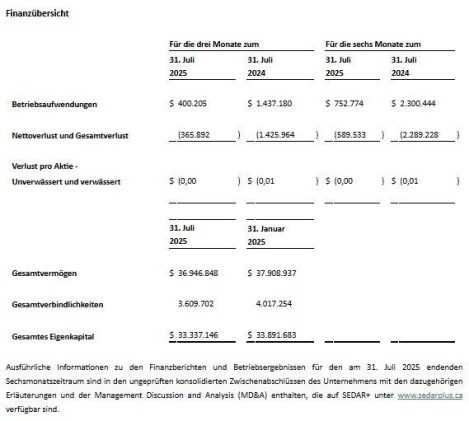 Clean Air Metals Inc. („Clean Air Metals” oder das „Unternehmen”) (TSXV:AIR)(FWB:CKU)(OTCQB:CLRMF) gibt bekannt, dass es seinen ungeprüften konsolidierten Zwischenabschluss und die Management Discussion and Analysis (MD&A) für den am 31. Juli 2025 endenden Sechsmonatszeitraum eingereicht hat. Die Dokumente können unter www.sedarplus.ca eingesehen werden. Finanzielle Highlights – Gesamtvermögen zum 31. Juli 2025 in Höhe von 36.946.848 $ – Gesamtbarvermögen zum […]