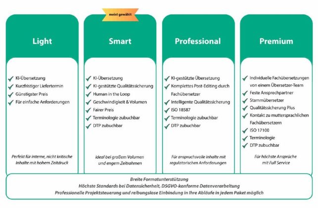 Sie möchten Ihre Inhalte schnell, zuverlässig und wirtschaftlich übersetzen lassen? Mit unseren vier Übersetzungspaketen erhalten Sie genau die Unterstützung, die Sie dafür brauchen – kombiniert aus professioneller Fachkompetenz, moderner Technologie und klaren, transparenten Prozessen. Sie definieren Ihre Anforderungen und wählen dann das für Sie passende Paket aus – der Schieberegler für Budget, Zeit und Qualität […]