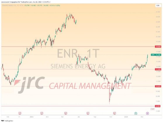 Die Aktie des deutschen Energietechnik-Unternehmens Siemens Energy AG ist seit Ende Oktober 2023 von 6,40€ bis zum heutigen Handelstag um über 150% auf 16,22€ gestiegen. Alleine gestern legte der Titel zeitweise um fast 8% zu und steht auch heute wieder fast 4% im Plus. Grund für den jüngsten Anstieg könnten Äußerungen des Konzerns sein, dass […]