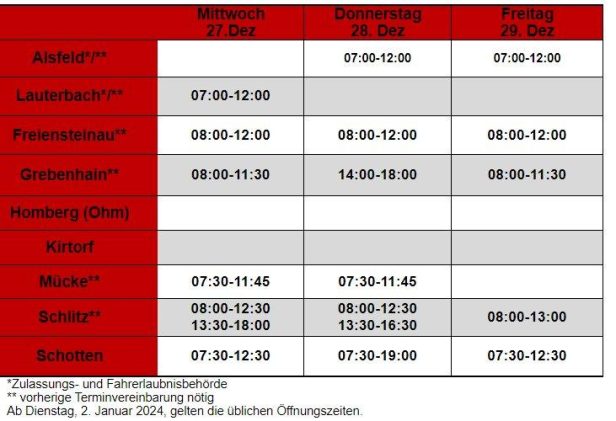 Die Zulassungs- und Fahrerlaubnisbehörde des Vogelsbergkreises ist zwischen den Jahren geöffnet: am 27. Dezember der Standort in Lauterbach von 7 bis 12 Uhr, am 28. und 29. Dezember die Zulassungsstelle in Alsfeld ebenfalls von 7 bis 12 Uhr. Für Fahrerlaubnis- und Zulassungsangelegenheiten an den Standorten Alsfeld und Lauterbach muss über die Homepage www.vogelsbergkreis.de, „Bürger-Service“, Bereich „Auto, Verkehr […]