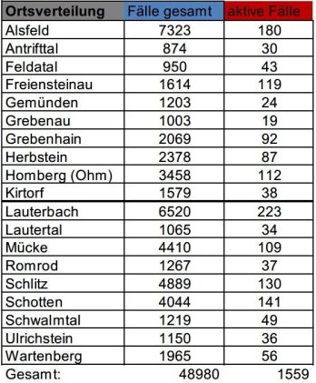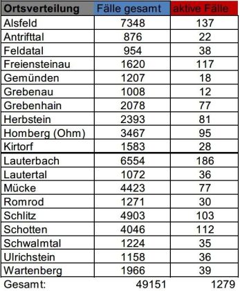 Am Montag meldet das Gesundheitsamt des Vogelsbergkreises 64 Neuinfektionen mit SARS-CoV-2 im Kreisgebiet. Aktuell betreut die Behörde 1.559 aktive Fälle. Für den Vogelsbergkreis weist das Robert-Koch-Institut (RKI) eine Sieben-Tage-Inzidenz von 646,3 aus. Hessenweit liegt der Wert bei 475,9. Die Sieben-Tage-Inzidenz der Hospitalisierungen liegt in Hessen bei 8,05. Die Übersicht für den Vogelsbergkreis: Fälle gesamt: 48.980 […]