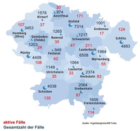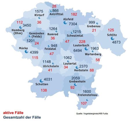 Am Dienstag meldet das Gesundheitsamt des Vogelsbergkreises 171 Neuinfektionen mit SARS-CoV-2 im Kreisgebiet. Bei der Behörde meldeten sich 451 Menschen als genesen – somit werden aktuell 1.279 aktive Fälle betreut. Für den Vogelsbergkreis weist das Robert-Koch-Institut (RKI) eine Sieben-Tage-Inzidenz von 568,7 aus. Hessenweit liegt der Wert bei 444,4. Die Sieben-Tage-Inzidenz der Hospitalisierungen liegt in Hessen […]