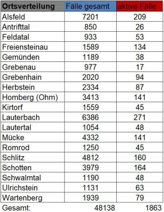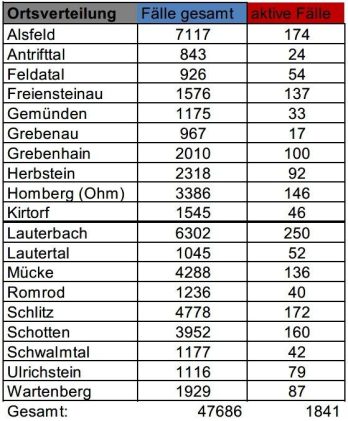 Am Freitag meldet das Gesundheitsamt des Vogelsbergkreises 145 Neuinfektionen mit SARS-CoV-2 im Kreisgebiet. Weiterhin registrierte die Behörde 184 Meldungen über Genesungen. Somit werden aktuell 1.863 aktive Fälle betreut. Im Vogelsbergkreis weist das Robert-Koch-Institut (RKI) eine Sieben-Tage-Inzidenz von 1.106,3 aus. Hessenweit liegt der Wert bei 828,7. Die Sieben-Tage-Inzidenz der Hospitalisierungen liegt in Hessen bei 12,88. Die […]