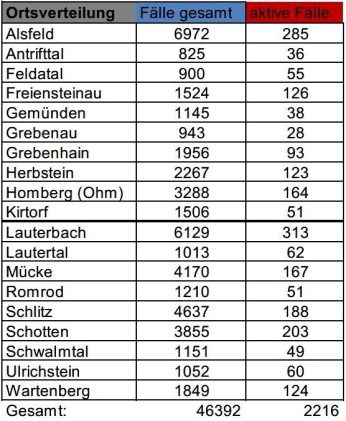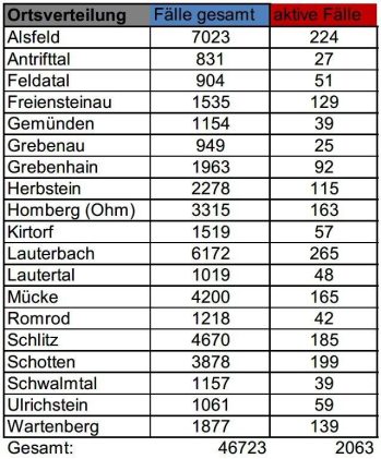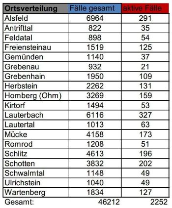 127 Neuinfektionen mit SARS-CoV-2 meldet das Gesundheitsamt des Vogelsbergkreises am Samstag. Es wurden keine Genesenen von der Behörde registriert, sodass dort aktuell 2.057 aktive Fälle betreut werden. Für das Kreisgebiet weist das Robert-Koch-Institut (RKI) eine Sieben-Tage-Inzidenz von 1.115,7 aus. Hessenweit liegt der Wert bei 794,3. Die Sieben-Tage-Inzidenz der Hospitalisierungen liegt in Hessen bei 7,72 (Stand: […]