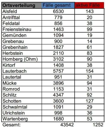 Vogelsbergkreis. 89 Neuinfektionen mit SARS-CoV-2 meldet das Gesundheitsamt des Vogelsbergkreises am Donnerstag. 67 Menschen haben sich als genesen gemeldet, sodass die Behörde aktuell 1.252 aktive Fälle betreut. Für das Kreisgebiet weist das Robert-Koch-Institut (RKI) eine Sieben-Tage-Inzidenz von 417,0 aus. Hessenweit liegt der Wert bei 378,8. Die Sieben-Tage-Inzidenz der Hospitalisierungen in Hessen liegt bei 4,1. Die […]