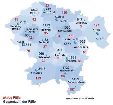 . 83 Neuinfektionen mit SARS-CoV-2 meldet das Gesundheitsamt des Vogelsbergkreises am Freitag. 54 Menschen meldeten sich bei der Behörde als genesen, sodass dort aktuell 1.324 aktive Fälle betreut werden. Für das Kreisgebiet weist das Robert-Koch-Institut (RKI) eine Sieben-Tage-Inzidenz von 476,8 aus. Hessenweit liegt der Wert bei 375,9. Bei der Sieben-Tage-Inzidenz der Hospitalisierungen meldet das RKI […]