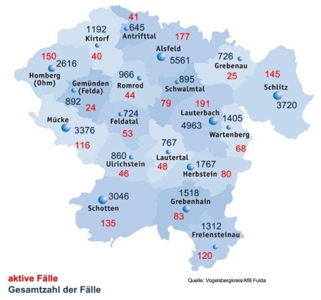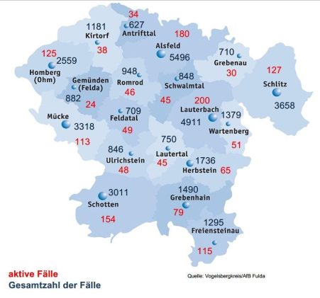 376 Neuinfektionen mit SARS-CoV-2 meldet das Gesundheitsamt des Vogelsbergkreises am Dienstag. 423 Menschen haben sich nach dem Wochenende bei der Behörde als genesen gemeldet, sodass diese aktuell 1665 aktive Fälle bereut. Laut Robert-Koch-Institut (RKI) liegt die Sieben-Tage-Inzidenz im Vogelsbergkreis bei 919,4 – hessenweit bei 926,0. Die Sieben-Tage-Inzidenz der Hospitalisierungen in Hessen weist das RKI mit […]