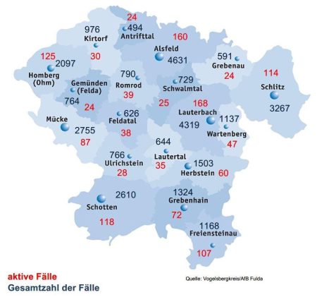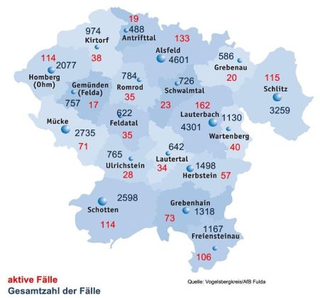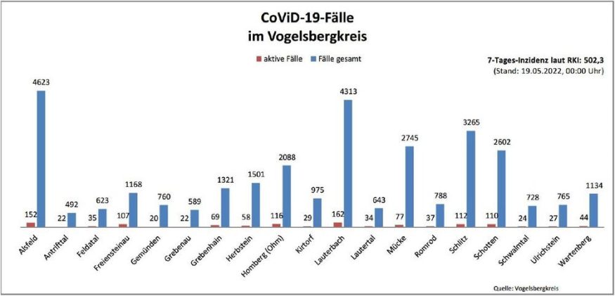 64 Neuinfektionen mit SARS-CoV-2 meldet das Gesundheitsamt des Vogelsbergkreises am Samstag. Erneut hat sich niemand als genesen gemeldet, sodass die Behörde nun 1.389 aktive Fälle betreut. Laut Robert-Koch-Institut (RKI) liegt die Sieben-Tage-Inzidenz im Vogelsbergkreis bei 480,5 – für Hessen bei 413,4. Die Sieben-Tage-Inzidenz bei den Hospitalisierungen gibt das RKI mit 3,7 (Stand: 20. Mai 2022) […]