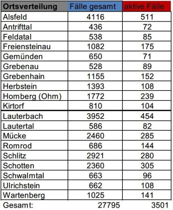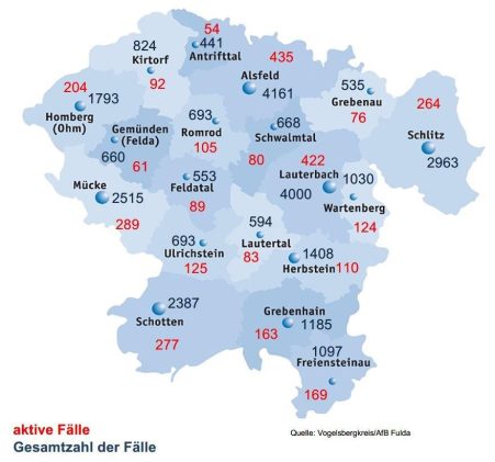 363 neue Corona-Infektionen meldet das Gesundheitsamt des Vogelsbergkreises am Mittwoch, die sich auf alle Städte und Gemeinden des Kreises verteilen. Niemand hat sich als genesen gemeldet, sodass die Behörde aktuell 3585 aktive Fälle betreut. Aufgrund eines Übermittlungsfehlers beim Robert-Koch-Institut (RKI) weist das Dashboard eine stark abweichende Inzidenz auf. Die Sieben-Tage-Inzidenz liegt laut RKI für den […]