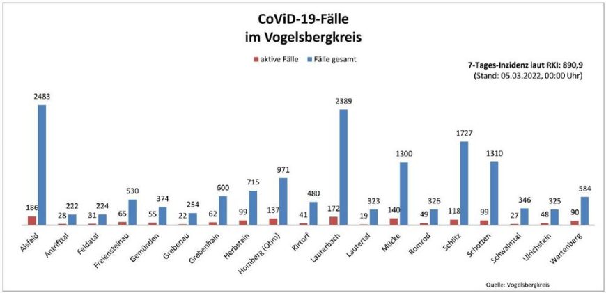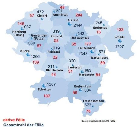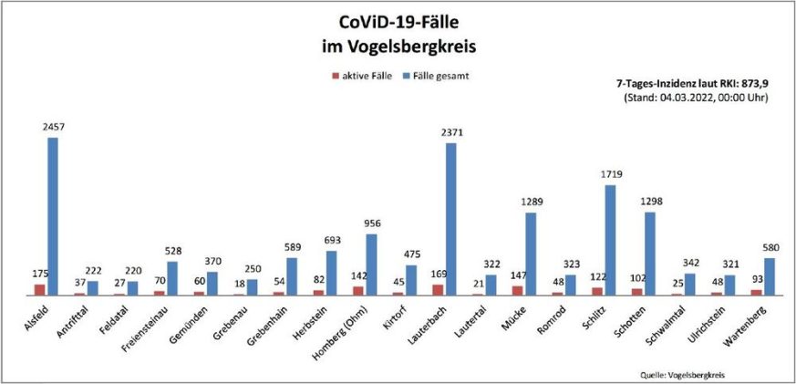Das Gesundheitsamt meldet 300 Neuinfektionen mit SARS-CoV-2 in verschiedenen Städten und Gemeinden im Kreisgebiet. Bei der Behörde gingen in den vergangenen Tagen weiterhin 606 Genesenen-Meldungen ein. Das Gesundheitsamt betreut somit aktuell 1182 aktive Fälle. Das Robert-Koch-Institut (RKI) meldet für den Vogelsbergkreis eine Sieben-Tage-Inzidenz von 988,6 – hessenweit liegt der Wert bei 933,9. Die Hospitalisierungsinzidenz in […]